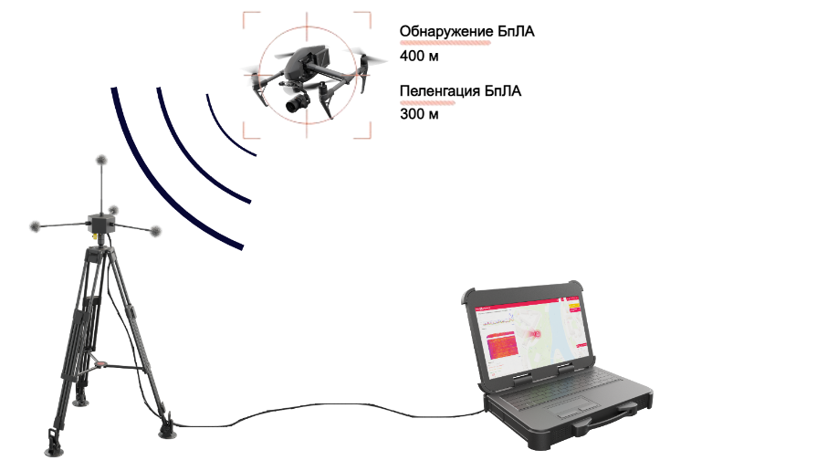 Направление на БпЛА определяется за счет обработки звукового сигнала от четырех разнесенных в пространстве микрофонов.